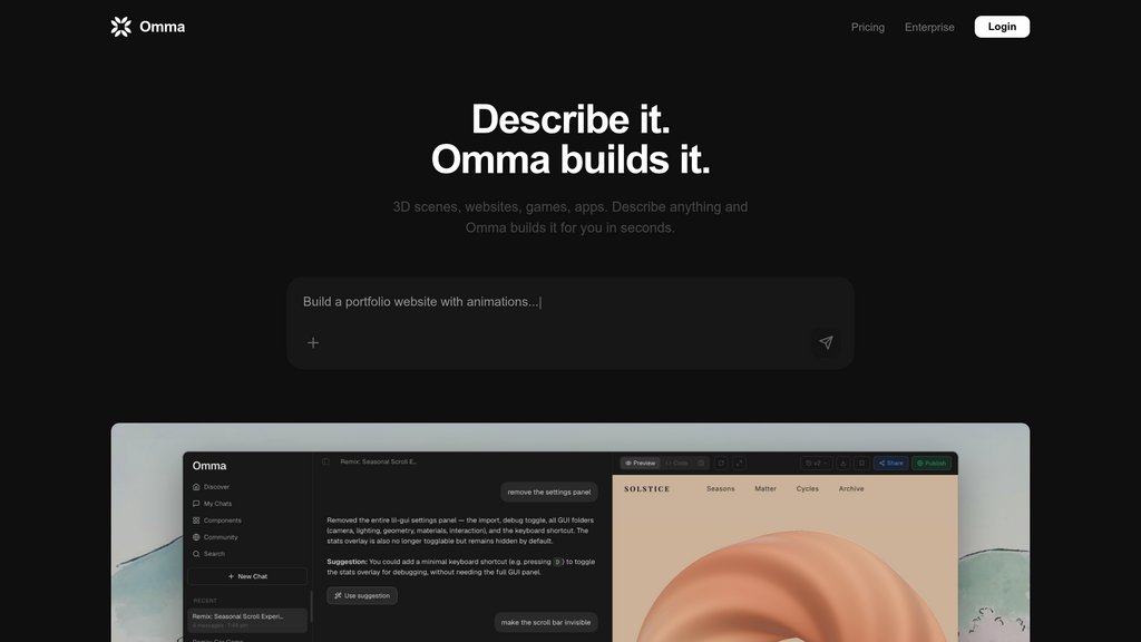 Users describe what they want in plain text, and Omma generates fully functional websites, 3D scenes, apps, or games within seconds — no coding or setup needed.