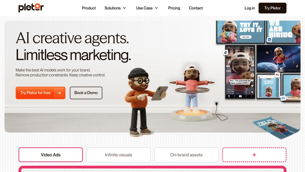 Pletor is a unified creative platform that functions as 'Zapier for visual marketing,' enabling marketers and creative teams to build custom agents that automate visual content production. The platform consolidates access to leading AI models including OpenAI, Gemini, Runway, Kling, Black Forest Labs Flux, Higgsfield, and ElevenLabs into a single workflow. Users can create agents from proven templates or build their own, setting brand guardrails to ensure consistent output while dramatically reducing production time from weeks to minutes. The platform supports static image generation, video ads, UGC content, and hyper-personalized visuals, with integrations for Meta, TikTok, Google Drive, and automation tools like Zapier and Make.