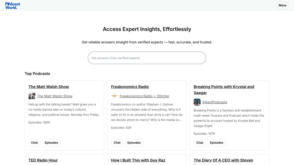 PodcastWorld is an innovative AI-driven platform designed to revolutionize podcast discovery and engagement. It scans millions of podcast conversations to provide users with exact audio clips answering their questions, detailed episode summaries, and full transcripts. The platform also enables users to interact with AI-generated clones of popular podcasters and guests, creating a dynamic conversational experience. Additionally, PodcastWorld offers podcasters powerful tools to repurpose their content into marketing assets such as blogs, newsletters, and social media posts, all while preserving their unique brand voice.