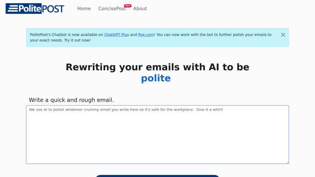PolitePost is an innovative AI tool designed to enhance the professionalism and clarity of workplace emails. Available on platforms like ChatGPT Plus and Poe.com, it allows users to input rough drafts of emails, which the AI then refines to ensure they are polite and suitable for professional communication. This tool is particularly beneficial for individuals looking to improve their email etiquette without spending excessive time on revisions. PolitePost operates on a user-support model, promoting transparency regarding costs and privacy.
