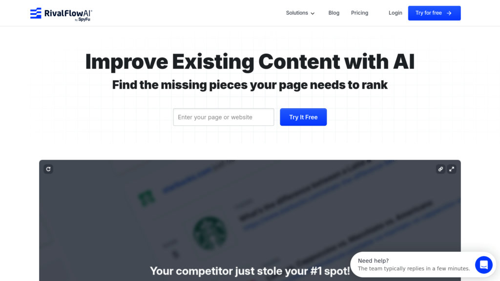 AI-driven SEO tool focused on optimizing existing web content by analyzing competitors and providing actionable recommendations to improve search rankings.