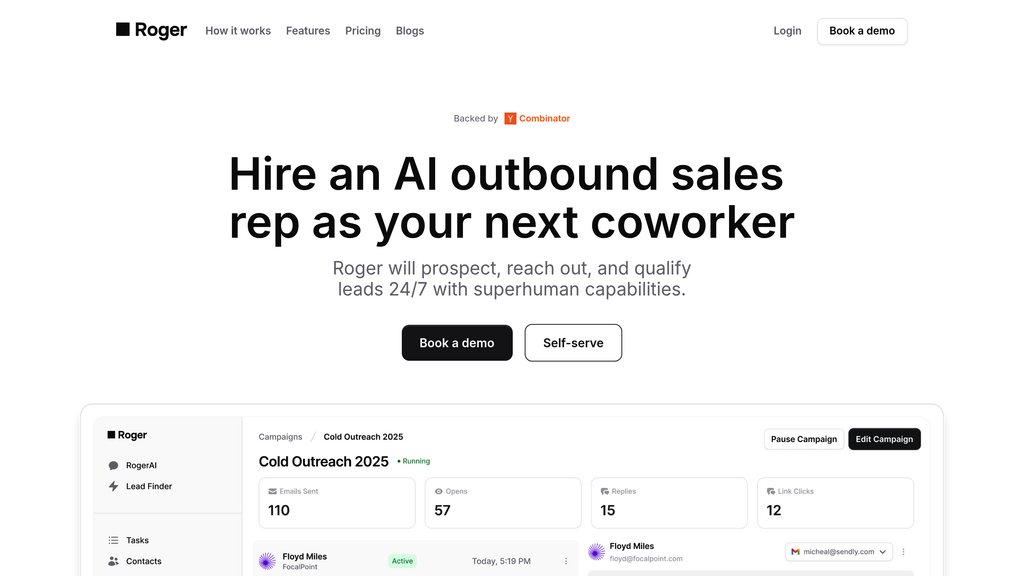 Roger is an outbound sales automation platform backed by Y Combinator (S24) and built by Augment Inc. It functions as a fully managed AI sales development representative (SDR) that handles the entire top-of-funnel sales process — from finding ideal leads to sending personalized emails and LinkedIn messages, following up, and booking meetings. Rather than replacing your sales team, Roger works alongside a dedicated human SDR who oversees and optimizes campaigns, giving companies the speed of automation with strategic human judgment.