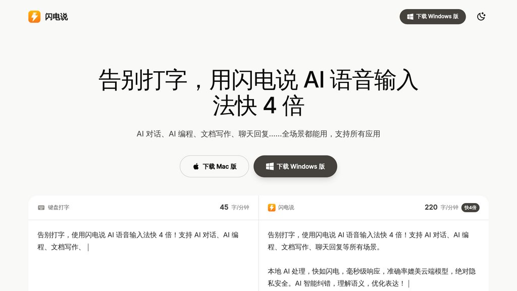 闪电说 is an innovative voice-to-text input solution that processes speech locally on your device rather than relying on cloud servers. This edge-computing approach enables millisecond-level response times while maintaining complete data privacy. The application combines advanced speech recognition with semantic understanding to deliver intelligent error correction that filters out conversational fillers and optimizes sentence structure. With input speeds reaching 220 characters per minute—four times faster than traditional keyboard typing at 45 characters per minute—闪电说 streamlines writing and coding workflows across all applications. The software supports both local and cloud-based AI models, ensuring accuracy comparable to server-side solutions while keeping all voice data confined to your device.