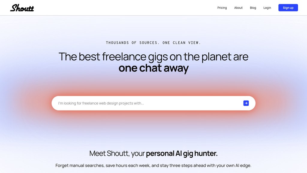 Shoutt is a London-based freelance opportunity discovery platform built for independent professionals who want to spend less time hunting for work and more time doing it. Its always-on agent monitors thousands of sources across the web 24/7, filters out spam, duplicates, and lowball offers, and delivers a personalised feed of vetted gigs matched to each user's skills and preferences. Rather than manually browsing fragmented job boards and marketplaces, freelancers interact with a conversational interface to define what they want โ and Shoutt handles the rest, alerting users in real time via Slack so they can apply early and stay ahead of the competition. The platform operates on a freemium model with transparent, no-hidden-fee pricing.