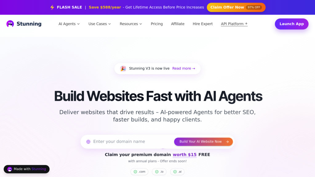 Stunning.so is an AI-driven website builder designed to accelerate the creation, customization, and deployment of professional websites without coding. It enables agencies, freelancers, and businesses to build client websites quickly using simple prompts, while also generating SEO-optimized marketing content such as blogs, social posts, and ads. The platform supports white-labeling, multi-client management, and real-time collaboration, making it ideal for scaling digital services efficiently. Stunning.so combines AI-assisted design, content generation, and marketing automation to streamline workflows and maximize agency revenue.