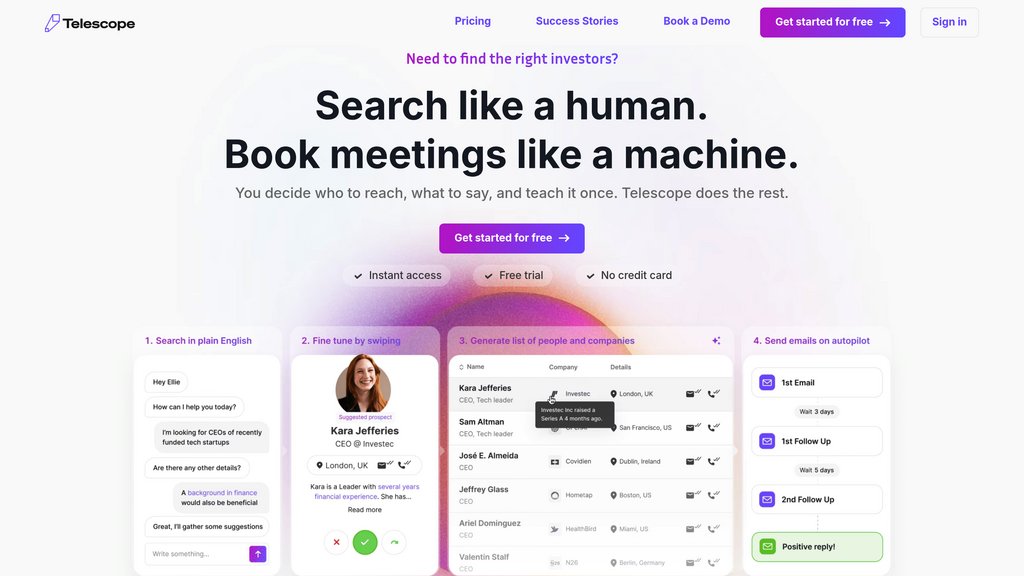 Telescope is an AI-powered sales and marketing tool designed to streamline lead generation by automatically creating highly qualified prospect lists. Leveraging a global B2B database with over 900 million person profiles and 50 million company profiles, it uses advanced natural language search and customizable smart criteria to deliver precise, enriched leads. Telescope integrates seamlessly with popular CRMs and supports automated outreach, enabling businesses to accelerate sales pipelines and expand into niche markets efficiently.