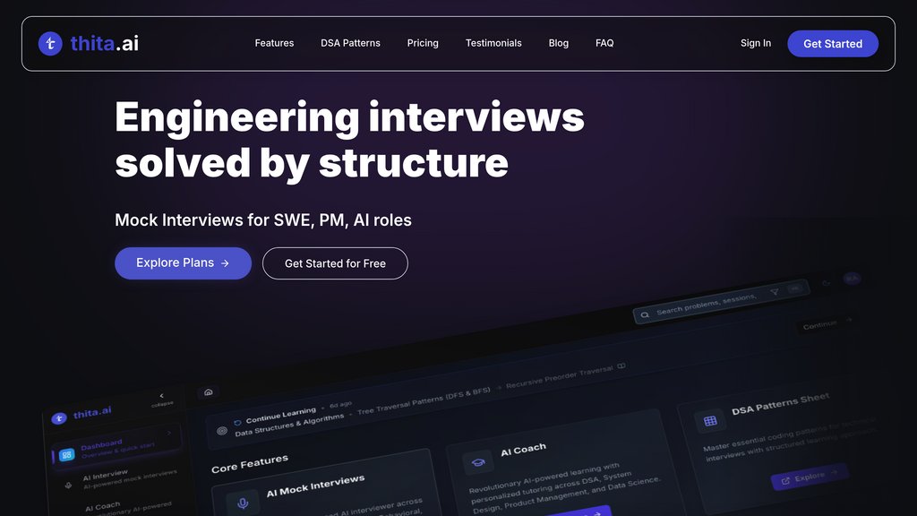 Thita.ai is a comprehensive technical interview preparation platform designed to help engineers master coding interviews at top tech companies. The platform combines structured learning of 90+ algorithmic patterns with interactive mock interviews that simulate real technical conversations. Users engage with adaptive interview scenarios covering data structures, algorithms, system design, and behavioral rounds, receiving instant feedback on their approach and solutions. Beyond interview practice, Thita.ai provides resume analysis and optimization, multi-domain learning tracks spanning system design, product management, and data science, and persistent learning resources that help candidates build understanding rather than memorize solutions.