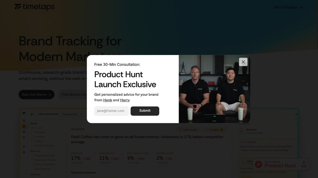 Timelaps is a brand intelligence platform that replaces slow, expensive agency reports with a continuously updated live dashboard. It surveys 4,000+ real consumers in your target demographic on an ongoing basis, tracking key brand health metrics — awareness, consideration, salience, associations, and category entry points. Rather than waiting months for a static slide deck, brands get a living dashboard that updates in real time, overlays campaign activity, and includes an AI analyst to help interpret what's driving changes. Timelaps delivers research-grade insights at a fraction of the cost of traditional brand trackers.