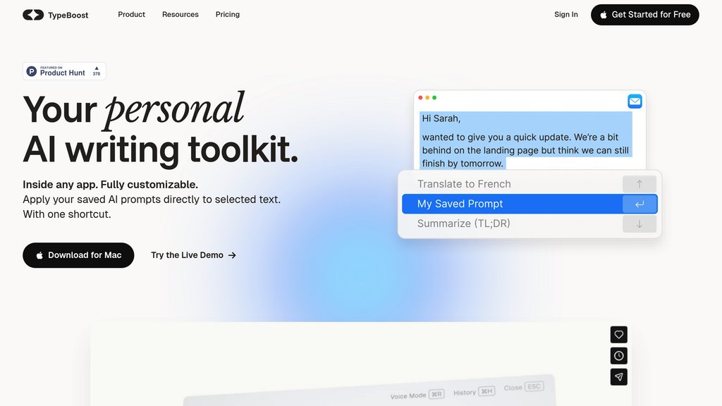 TypeBoost is a macOS-native writing productivity tool that embeds directly into your existing workflow. Instead of jumping between your app and a separate AI tool, you simply select any text, trigger TypeBoost with a global keyboard shortcut, and apply your saved prompt actions instantly — right where you're working. It supports multiple AI model providers, voice input, granular accept/reject editing, and cross-device sync, making it a fully customizable personal writing system rather than just another AI assistant.