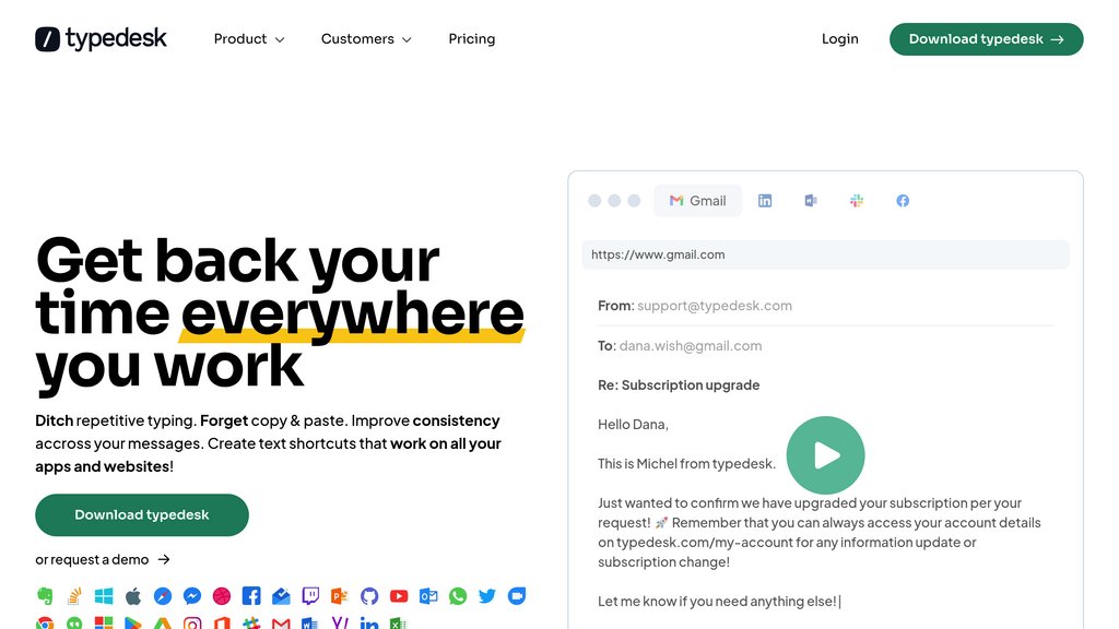 typedesk is a text expander and keyboard automation app designed to streamline communication for individuals and teams. It enables users to build, manage, and insert dynamic canned responses using customizable templates, variables, and shortcuts. With robust sharing features and cross-platform support, typedesk helps maintain message consistency and speed up repetitive typing tasks across email, customer support, and social platforms. The app works natively on Windows, Mac, and all major browsers, requiring no integration and offering offline access for uninterrupted productivity.