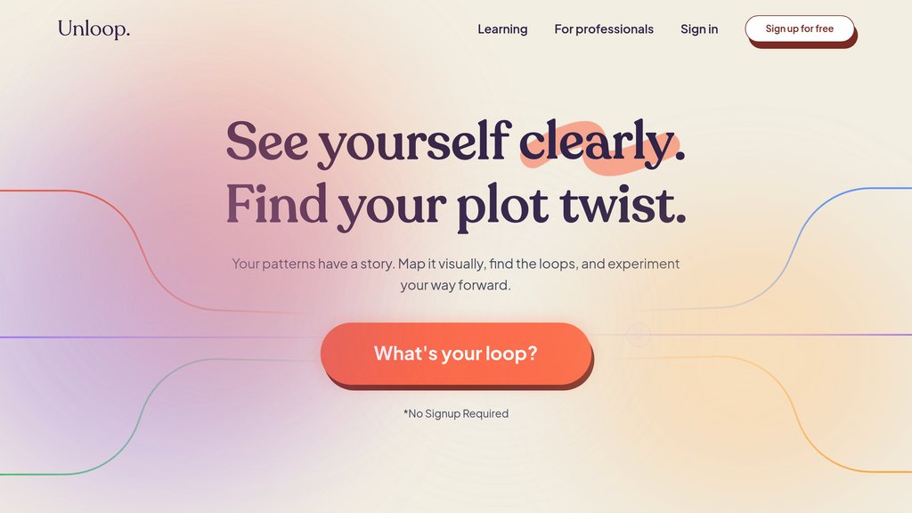Unloop is an innovative self-discovery platform that transforms how people understand their behavioral patterns. Rather than relying on traditional talk therapy or generic self-help advice, Unloop provides an interactive visual canvas where users map the triggers, thoughts, emotions, and behaviors that create self-reinforcing cycles. By representing these abstract patterns as visual feedback loops, Unloop makes the invisible visible—revealing the exact points where intervention can create change. The platform combines intuitive drag-and-drop interface design with contextual AI questioning to help users uncover breakthrough insights about why they repeat certain patterns. Users can then design micro-experiments to test behavioral changes directly within their mapped patterns, creating a closed-loop system of discovery and experimentation.