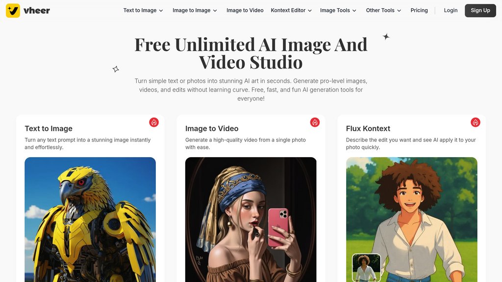 Vheer is a web-based creative suite designed to streamline the visual content creation process. The platform offers an integrated collection of tools for transforming creative ideas into polished visuals—from generating original images through descriptive text prompts to converting static images into animated videos. Users can access professional-grade editing capabilities including semantic photo editing via Flux Kontext, style-consistent image variations, batch background removal, and automated image-to-prompt conversion. The platform operates on a freemium model, providing unlimited access to core features without watermarks or signup requirements, while premium tiers unlock faster processing speeds and enhanced model options for users seeking production-level results.