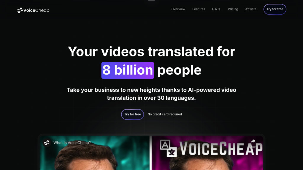 VoiceCheap is a cutting-edge AI platform designed to help content creators, educators, marketers, and businesses translate and dub videos into over 30 languages quickly and cost-effectively. It leverages advanced voice cloning, speech-to-text, text-to-speech, and SmartSync technology to produce natural, synchronized dubbing that preserves the original speaker’s cadence and tone. The platform supports multi-speaker videos with distinct voice cloning, automatic subtitle generation, and seamless integration with popular video sources like YouTube and social media. VoiceCheap aims to break language barriers, enabling users to expand their global reach with professional-quality localized content while reducing traditional dubbing costs.