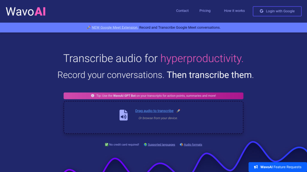 WavoAI is a sophisticated AI-driven transcription service designed to convert audio recordings into precise, annotated transcripts enriched with interactive AI insights. It supports multiple languages, accents, and dialects, offering speaker diarization and transcript annotations to enhance clarity. Beyond transcription, WavoAI provides advanced content analysis including summaries, to-do lists, and action points, enabling users to extract meaningful information efficiently. The platform integrates seamlessly into workflows, catering to professionals across industries such as academia, media, business, and healthcare.