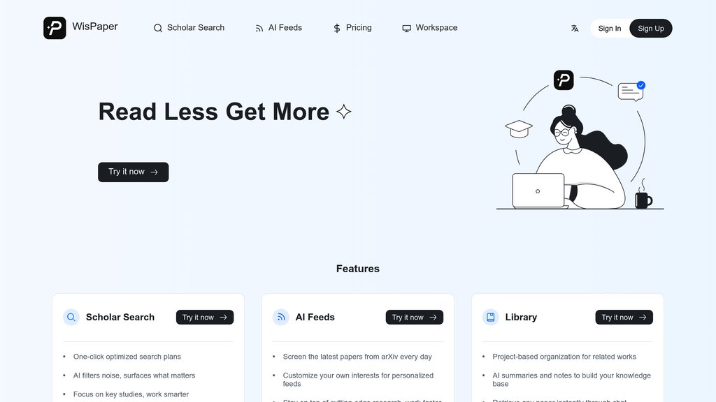 WisPaper is a comprehensive academic research platform developed by Fudan University that streamlines the entire research lifecycle. It combines intelligent literature discovery, systematic knowledge management, and continuous tracking of research frontiers into a unified workflow. The platform enables researchers to efficiently locate relevant papers from global academic databases, organize findings into customizable knowledge bases, and receive personalized alerts about new publications aligned with their research interests. By automating the most time-consuming aspects of literature review, WisPaper allows scholars to focus on critical analysis and innovation rather than manual paper screening.