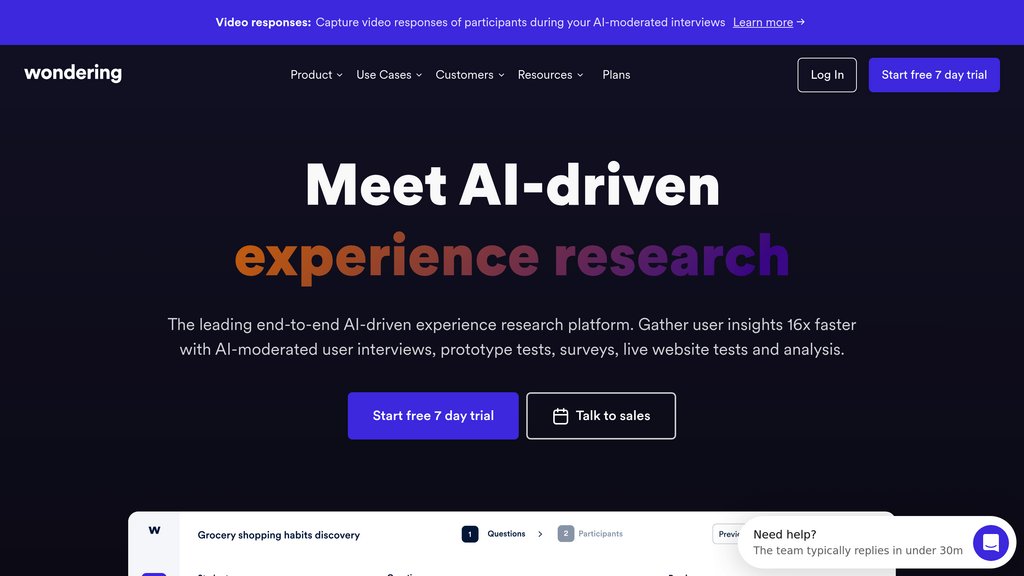 Wondering — это комплексная платформа для исследования пользовательского опыта, разработанная, чтобы помочь командам глубоко понимать своих пользователей и оптимизировать цифровые продукты. Платформа обеспечивает быстрые, масштабируемые исследования, автоматизируя интервью с пользователями, тестирование прототипов и работающих веб-сайтов, а также опросы, с поддержкой продвинутых конструкторов исследований и аналитических инструментов. Wondering поддерживает более 50 языков, предлагает набор участников как внутри продукта, так и через глобальную панель, и предоставляет действенные, основанные на фактах идеи для ускорения принятия решений и улучшения продукта.