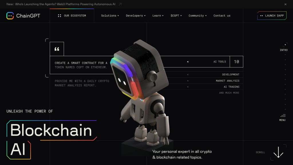 ChainGPT 是專為結合人工智慧、區塊鏈與 Web3 生態系而設計的 AI 基礎設施,提供多元 AI 工具,包括智能合約生成與稽核、NFT 創建、AI 交易助理及加密市場分析。平台運用訓練於區塊鏈與加密數據的先進 AI 模型,為開發者、交易者、企業及愛好者帶來即時、安全且易用的解決方案。ChainGPT 原生代幣 $CGPT 作為生態系燃料,開啟高級功能、質押獎勵及去中心化治理參與。ChainGPT 致力於推動區塊鏈普及化,並持續透過 API 與 SDK 支援開發者整合,邁向 AI 原生區塊鏈基礎建設。