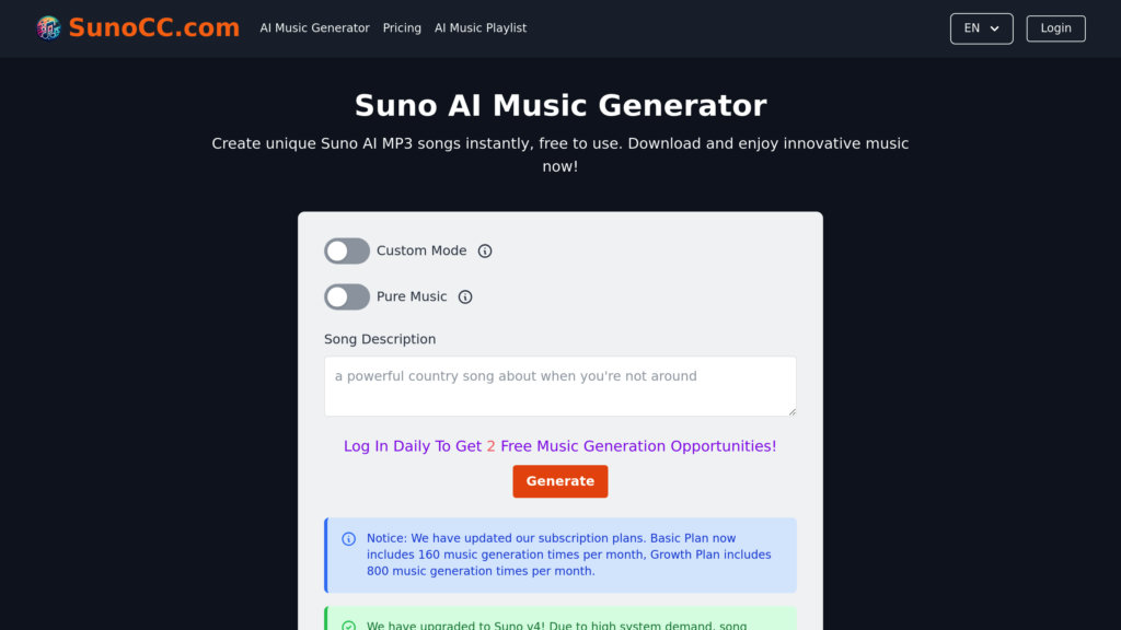 SunoCC AI 是一款先進的 AI 音樂生成平台,讓用戶只需描述想要的音樂風格或主題,即可創作原創歌曲與純音樂。支援流行、古典、電子、爵士等多種曲風,並提供歌詞或純音樂選項。平台介面直覺、操作快速,適合各種程度的用戶,輕鬆產出可下載、可用於個人或創意專案的專業音樂。