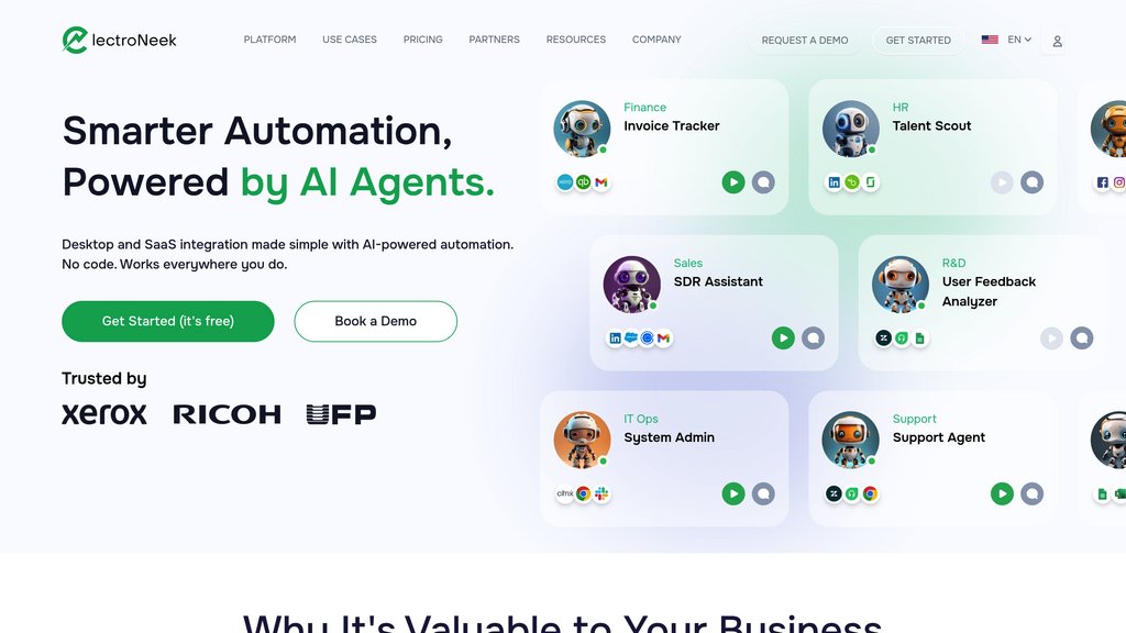 ElectroNeek是一个多功能自动化平台,旨在通过低代码工具、机器人流程自动化(RPA)和智能文档处理(IDP)简化和加速业务流程。它使没有编码专业知识的用户能够构建、管理和扩展与现有系统无缝集成的自动化工作流。ElectroNeek支持本地部署以确保数据安全和合规性,同时提供广泛的功能来自动化文档处理、桌面任务和基于浏览器的流程。