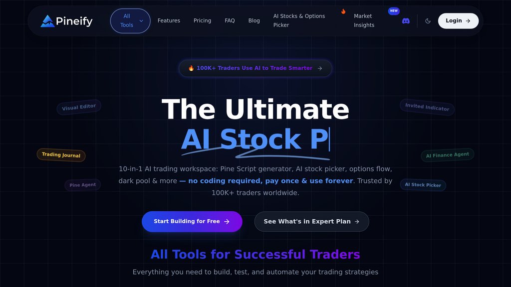 Pineify是为TradingView用户打造的一体化交易套件,让用户无需编写代码即可创建自定义指标和策略。它结合了可视化Pine Script编辑器、AI编程agent、AI选股器、金融研究聊天机器人和机构级市场情报工具——全部在单一终身许可下。受到150+个国家10万+交易者信赖,Pineify消除了交易想法与可运行、已回测策略之间的技术壁垒。