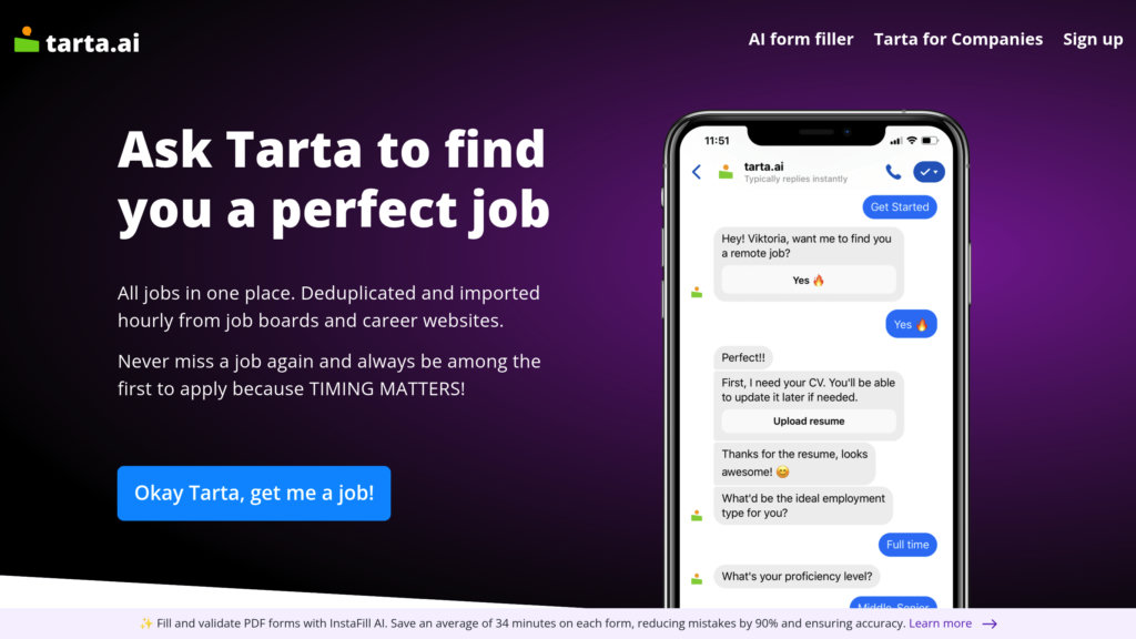 Tarta.ai 是一款全面的求职助手,旨在自动化和组织求职过程。它从领先的招聘网站和企业网站汇总职位列表,去除重复项,并实时更新机会。用户可以在一个直观的仪表板内受益于定制的职位提醒、内置的申请跟踪和任务管理工具。Tarta.ai 旨在通过集中从发现到跟进的每一步,为专业人士节省时间并提高求职效率。