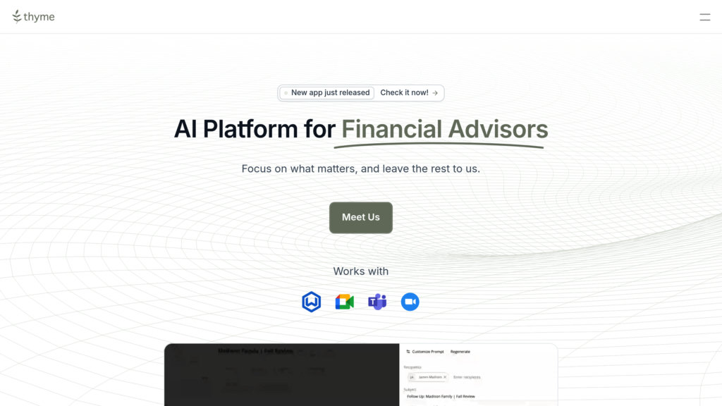 Thyme是一体化AI平台,专为理财顾问量身打造,助力高效、专业的客户会议。它能自动转录与总结会议内容,生成可执行任务,并与主流金融CRM(如Wealthbox、Redtail和Salesforce)直接同步。Thyme还提供高级文档解析、客户安全门户、集成开户表单(含电子签名)、以及高性价比账单系统。通过将多种顾问工具整合于一体,Thyme帮助顾问节省时间、降低软件成本、提升客户互动。