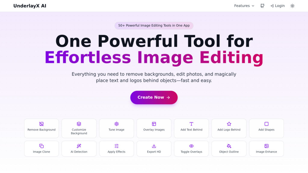 UnderlayX 是一款创新型在线图像编辑平台,利用AI简化对象克隆、背景移除/更换及在图像元素后方添加文本或形状等复杂编辑任务。界面友好,完全本地化处理,保障隐私并支持高分辨率输出,无需高级设计技能。UnderlayX 赋能创作者、市场人员和设计师,快速高效地在网页端制作专业级视觉作品。